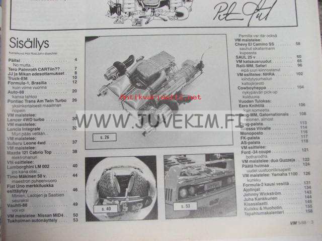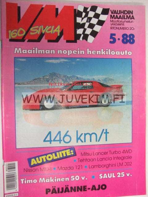 Vauhdin maailma 1988 nr 5 -mm. Tero Palmroth CARTiin, Truck MM, Pontiac Trans Am Tvin Turbo, Lancer 4WD Turbo, Fiat Uno merkkiluokka esiintyy, Chevy El Camino SS, Drag-MM Gatornationals, Nissan Mid4, Formula 1 Brasilia, Timo Mäkinen 50 vuotta. katso sisältö kuvista tarkemmin.21 x 29 cm.