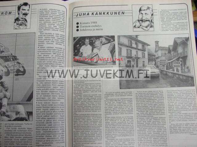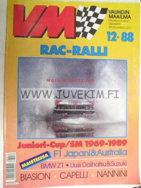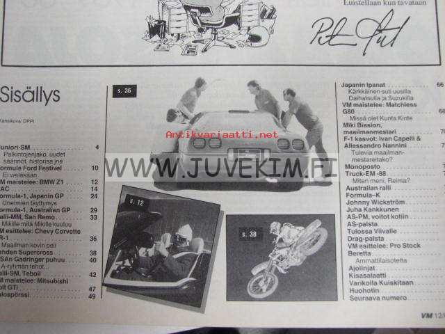 Vauhdin maailma 1988 nr 12 -mm. Formula Ford festival, Formula 1 Japanin ja Australian GP, VM maistelee BMW Z1 -Mitsibishi Colt GTi -Matchless G80, RAC, Ralli-MM San Remo, Lahden Supercross, Chevy Corvette ZR-1 Truck-EM -88, Australian Ralli, Formula 1 kasvot Ivan Capelli & Allessandro Nannini.21 x 29 cm.