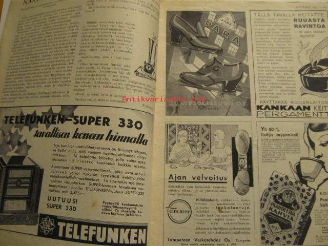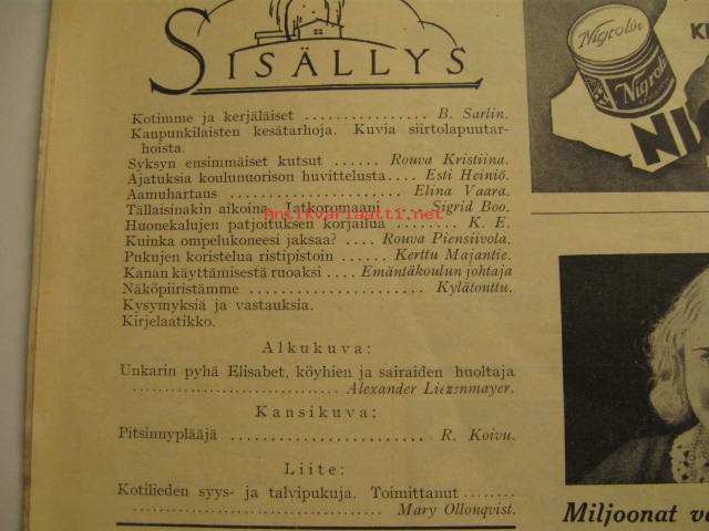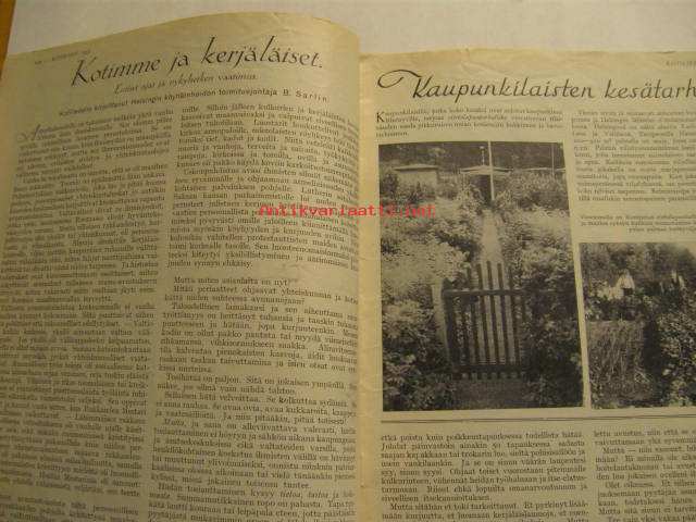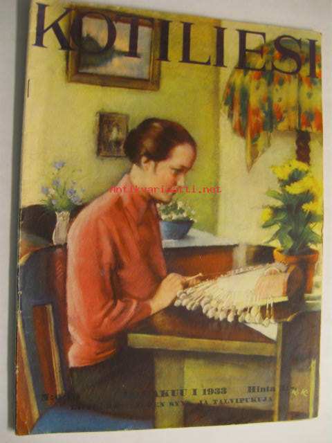 Kotiliesi 1933 nr 19 Lokakuu. Kansikuva Rudolf Koivu. Hatanpään siirtolapuutarha-alueesta koko aukeaman kuvasarja vuodelta 1933. Runsaasti mainoksia, muotia ja sisustusideoita. ( Ajankuvaa - hyviä vuosia ennen sotaa!)