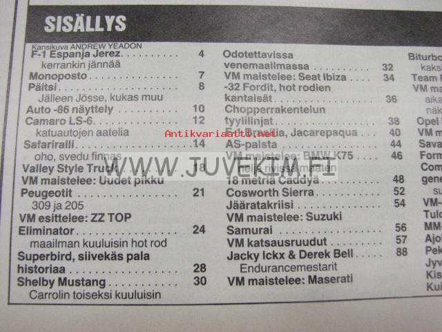 Vauhdin maailma 1986 nr 5 -mm. Camaro LS-6, Safari ralli, Valley Style Truck, ZZ TOP Eliminator "maailman kuuluisin Hot rod", Shelby Mustang Mazda R-7Jacky Ickx &
