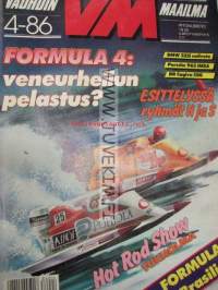 Vauhdin maailma 1986 nr 4 -mm. Formula 1 Brasilia kauden avajaiset, Ralli MM Portugal, INDY Chevy turbo F1 86, MM-jääspeedway, Formula 4BMW 325i 4-veto, Tukholman Hot-Rod Show Honda VF 1000 F2, Subaru XT, Kuukauden profiili Mika Arpiainen, IMSA-Porsche 962, Pro-Stock Suzuki, RR Cagiva 500.21 x 29 cm.