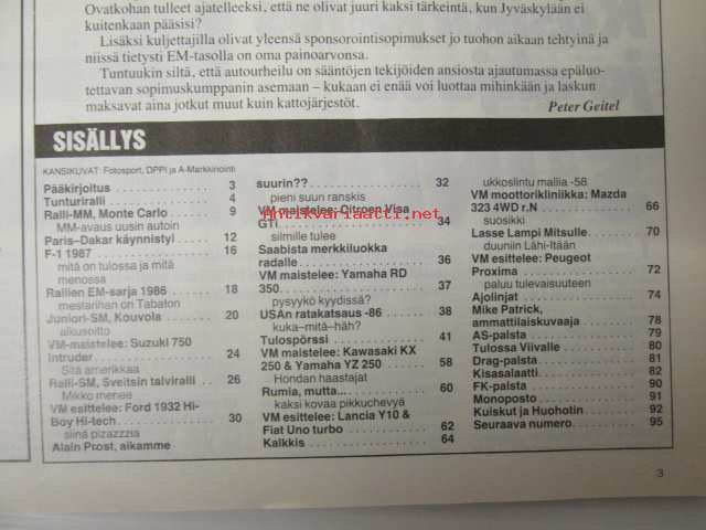 Vauhdin maailma 1987 nr 2, sis. mm. seur. artikkelit / kuvat / mainokset; mm. Formula 1 -87 mitä on tulossa ja mitä on menossa, Tunturiralli, Alain Prost aikamme