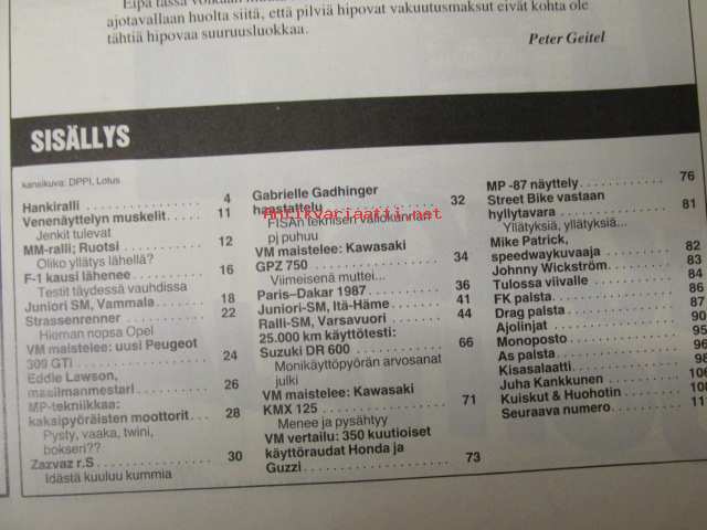 Vauhdin maailma 1987 nr 3, sis. mm. seur. artikkelit / kuvat / mainokset; mm. MM-ralli Ruotsi, Formula kausi lähenee testit täydessä vauhdissa, VM maistelee Kawasaki KMX 125 - Kawasaki GPZ 750R - Peugeot 309 GTi - Honda CB350S & Moto Guzzi V35III, Zazvaz r.S, Gabrielle Gadhinger haastattelu, Paris-Dakar 1987, MP-87 Street Bike näyttely, Eddie Lawson maailmanmestari, Junior SM vammala, Suzuki DR 600S, Mike Patrick, Opel Kadett -70 1900 Turbo, katso sisältö kuvista tarkemmin.21 x 29 cm.