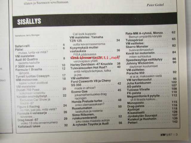 Vauhdin maailma 1987 nr 5, sis. mm. seur. artikkelit / kuvat / mainokset; mm. F3000 avaus, MM-Motocross, VM maistelee Audi 80 Quattro - Ducati 750 Paso - Yamaha TZR 125Ford CosworthV ( -Chevy SS 350 -Porsche 959 4WD -Sbarro Monster G V8, Figure 8 Racing, Drag kausi-87, Harley Davidson Knuclehead, Formula 1 Brasilia, Toyota Supra 3.0i rA, BMW M3 ralli, Simo Riikonen, Chevy Corvette -67, katso sisältö kuvista tarkemmin21 x 29 cm.