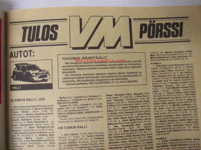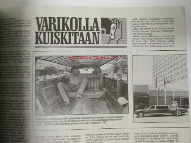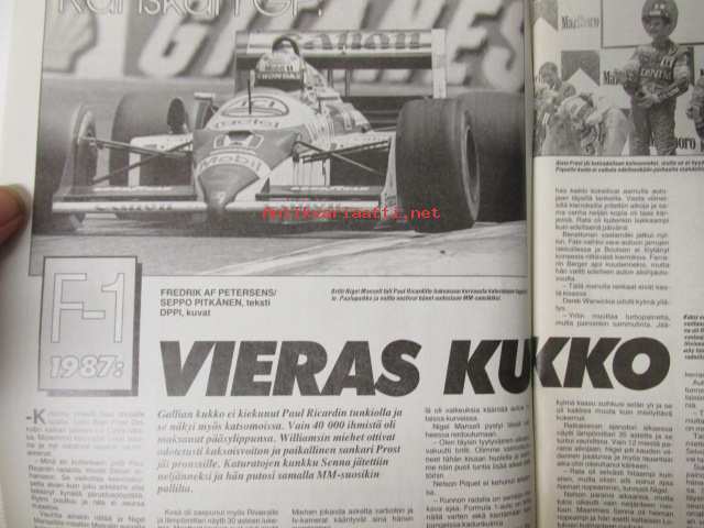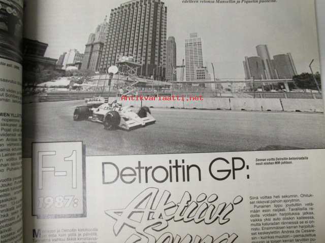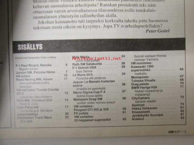 Vauhdin maailma 1987 nr 8, sis. mm. seur. artikkelit / kuvat / mainokset; mm. Formula 1 Paul Ricard Ranska ja USA Detroit, Le Mans 24h, Jaguar Le Mansin historian osana, Road Racing MM Assen, Artukainen Truck Race, VM vertailee Peugeot GTi 205 ja 309, Rata-PM ja SM, BMW Harrtge H26, CCamaro Sport Coupe -78, Toyota Corolla Coupe GT-Z, TM vertailussa Honda NS 125 R II - Suzuki RG 125 - Yamaha TZR 125, katso sisältö kuvista tarkemmin21 x 29 cm.
