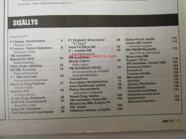 Vauhdin maailma 1987 nr 9, sis. mm. seur. artikkelit / kuvat / mainokset; mm. Formula-1 kasvo Satoru Nakajima, Pikes Peak kisa, RR-SM Kouvola, Ralli MM uusi