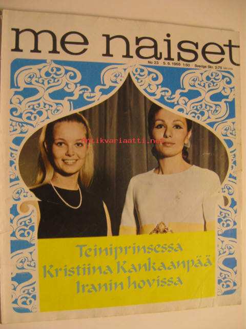 Me Naiset 1968 nr 23, Kuningatar - kuningatar Elisabeth 2 jakso. Maarita Mäkelä - suomalaisen elokuvan uusi tyttö. Kristiina Kankaanpää Iranin hovissa.