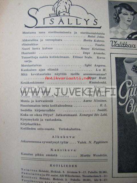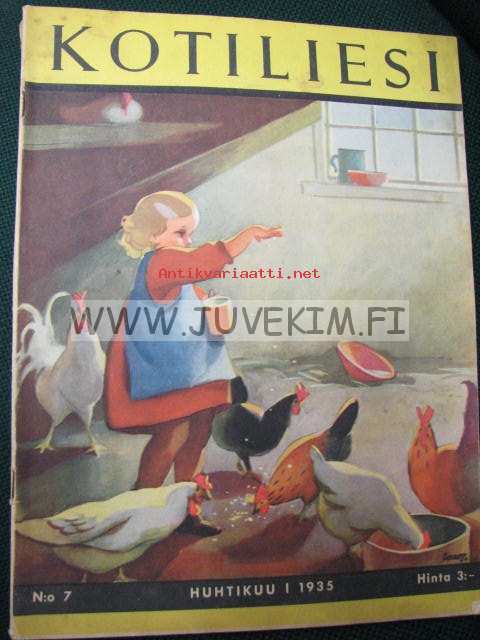 Kotiliesi 1935 nr 7 Huhtikuu 1935 (kansilehti Marta Wendelin) Vuoden 1935 kenkämallistoa esitellään. Ellinor Ivalon koti esitellään. Sinisukka -seurasta artikkeli kuvineen. Koko sivun mustavalkoinen SILO-mainos.