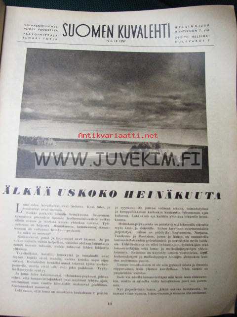 | Saatavilla | 1 kpl | | Julkaisuvuosi | 1951 | | Sivuja | 40 | | Kunto | K2 | | takakannessa pari pientä repeämää | | Sidonta/painoasu | Lehti | | Kielet | Suomi |