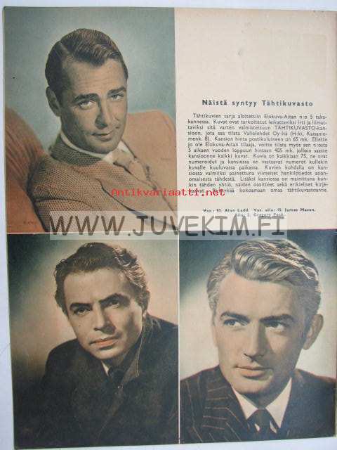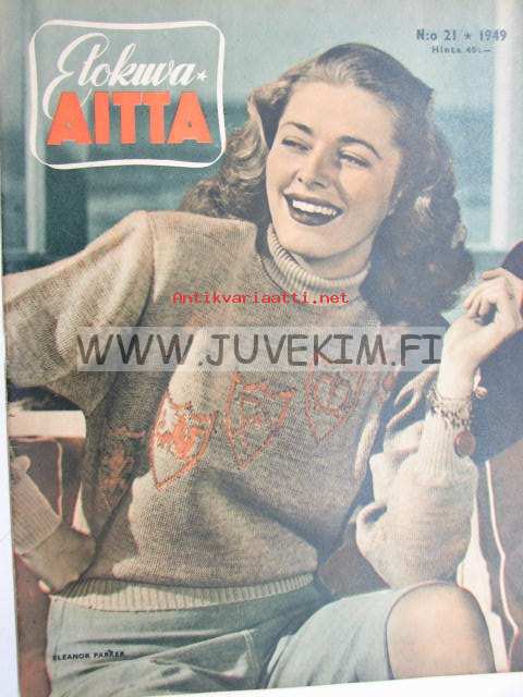Elokuva-Aitta 1949 nr 21 (kannessa Eleanor Parker), Ritva Arveloa ja Matti Oravistoa tapaamassa, Susan Hayward, Hollywoodin "Kuolemanlaivue", Tuulikki Mäki Hollywoodin filmilentäjänä, kävimme Moskovassa Edvin Laine, Valentin Vaala