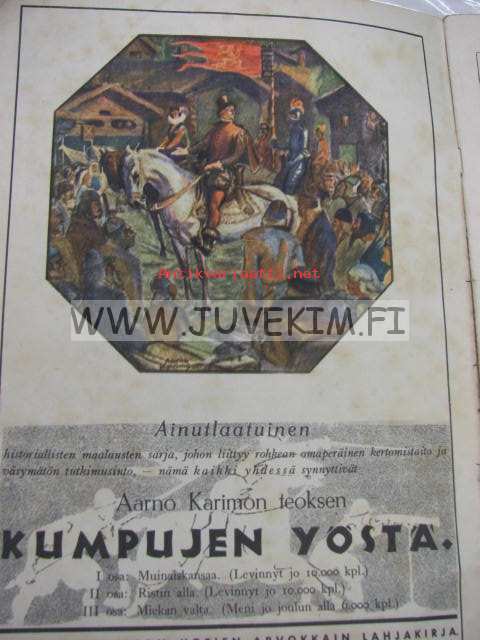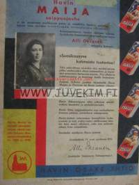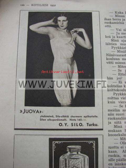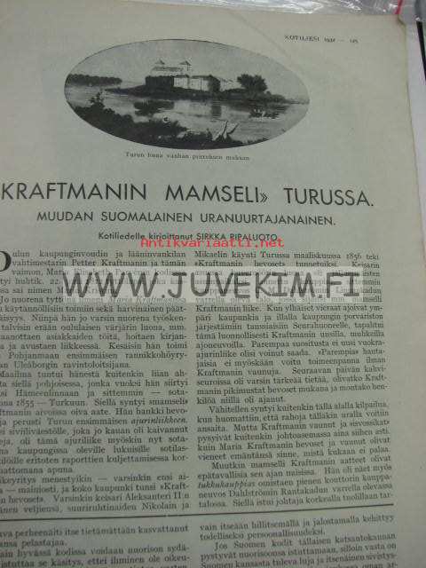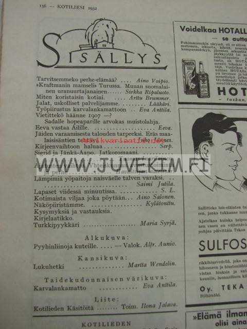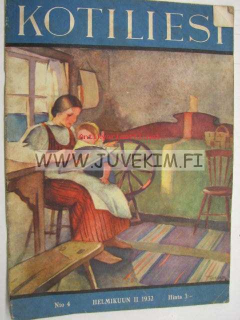 Kotiliesi 1932 nr 4 (kansi Martta Wendelin ). Helmikuu 1932. Värikuva Eva Anttilan suunnittelemasta karvalankamatosta. Artikkeli Kraftmanin mamselli Turussa (os.