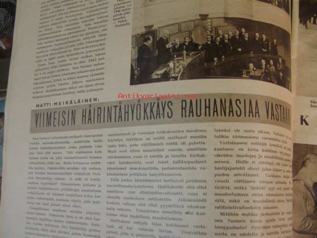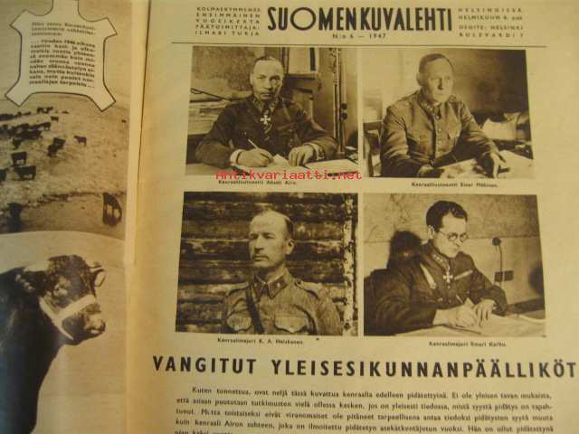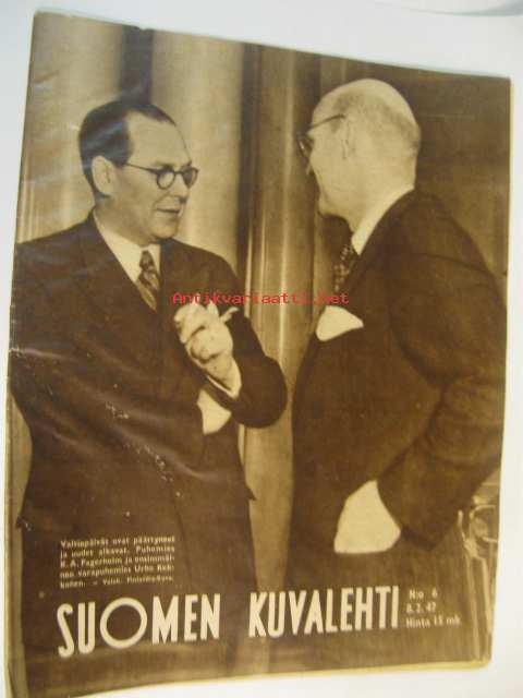 Suomen Kuvalehti 1947 nr 6 ilm. 8.2.1947 kansikuvassa Urho Kekkonen ja K.A. Fagerholm. rauhansopimus puheenvuoroja. Rauhansopimuksen ehdot ovat Suomelle raskaat, mielipiteitä professori Kalle Kauppi, Hertta Kuusinen, Juho Niukkanen, Onni Peltonen, Arvo salonen, Arno tuurna, Väinö Voionmaa ja John Österholm. Kaksi kuuluisaa rikollista, Erland Mattson ja Al Cabone. Kansanedustajan puheenvuoro: Päiviö Hetemäki. Takakannessa mainos: Lippo-sukset. Onnittelukuvissa: Walter Lampén 85 v. Kalle Läytänä 60v. Lauri Linnainmaa 50v.