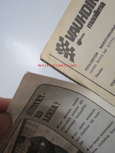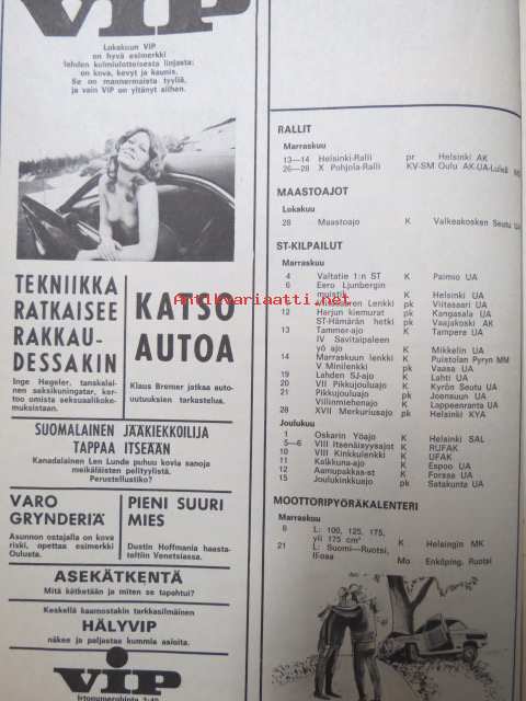 Vauhdin Maailma 1971 nr 10 -mm. Hannu Mikkolan ulosajo Jyskälässä. Viimeiset Pyynikin ajot, Kaksi katamarania Cougar ja Flipper, Ikäheimon ihme nopein Keimola 500, Nobby Clark mekaanikko vaikeissa käsineissä. Kauppaneuvos August Aaltonen muistokirjoitus. Eeva Heinonen artikkeli kuvineen. Ei keskiaukeamakuvaa21 x 29 cm.