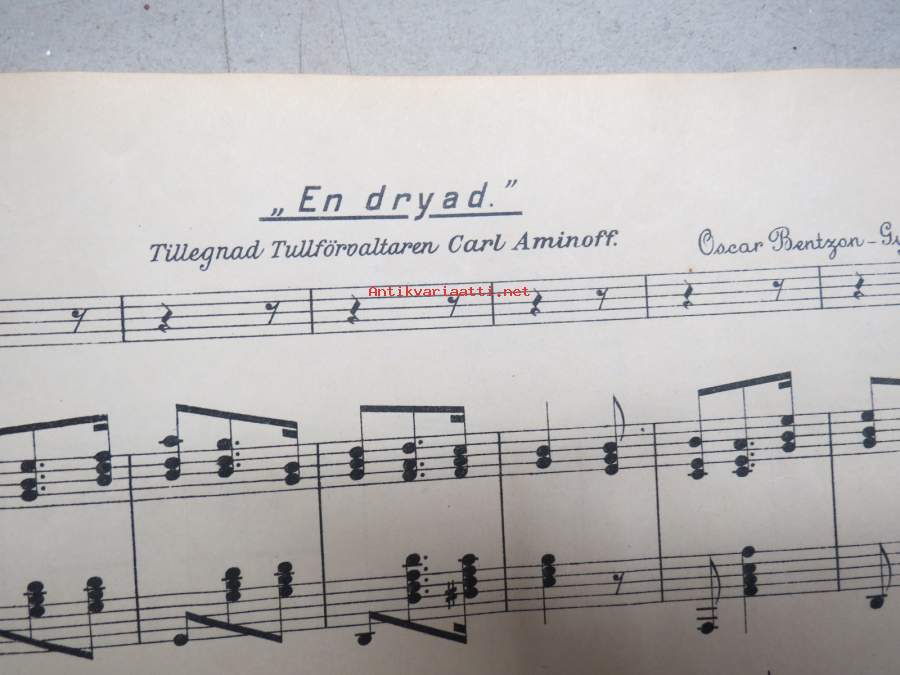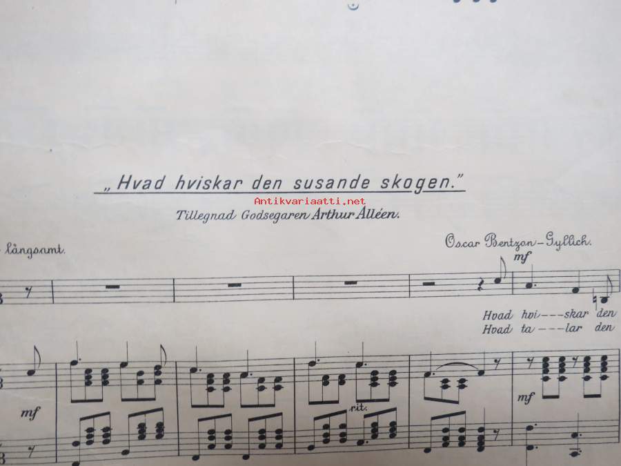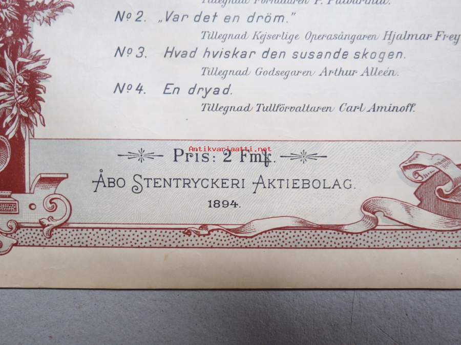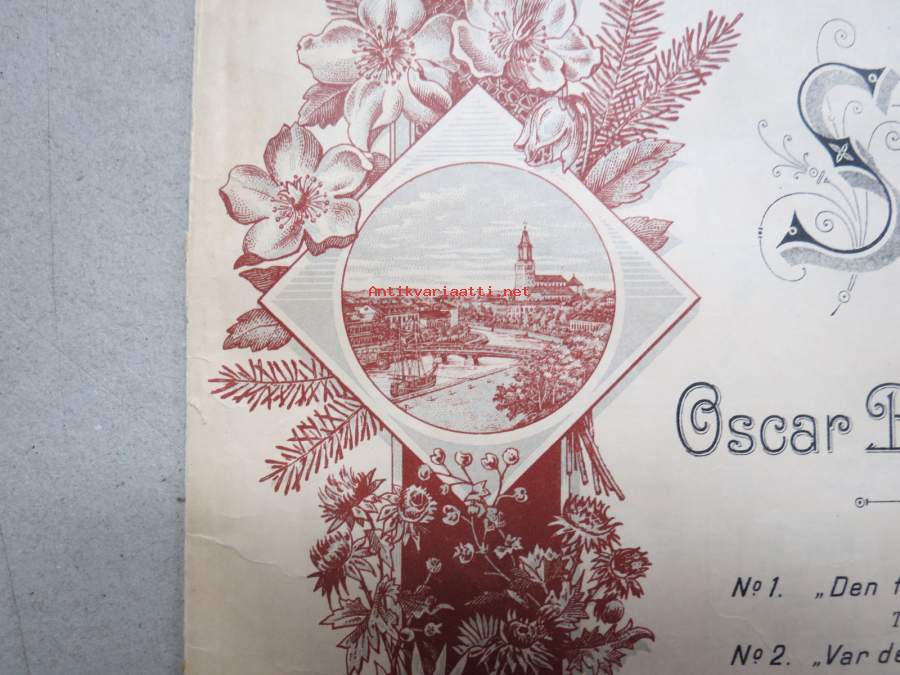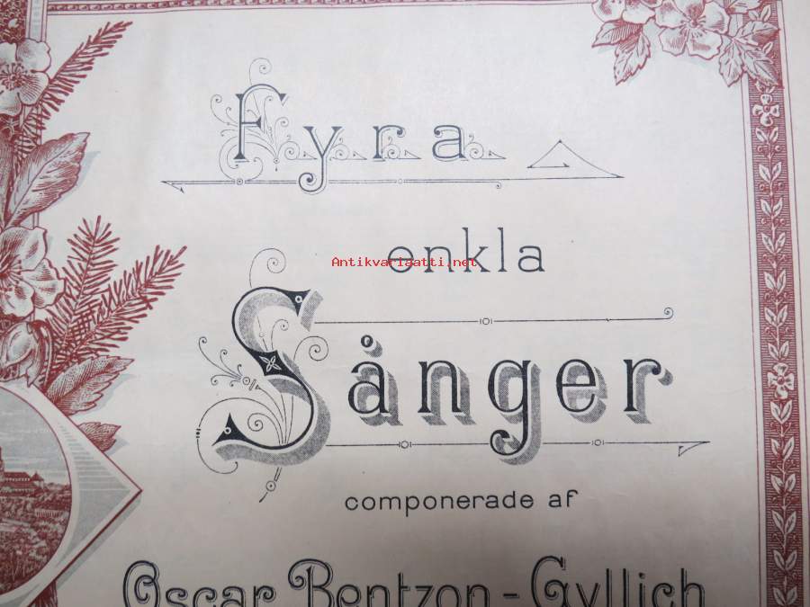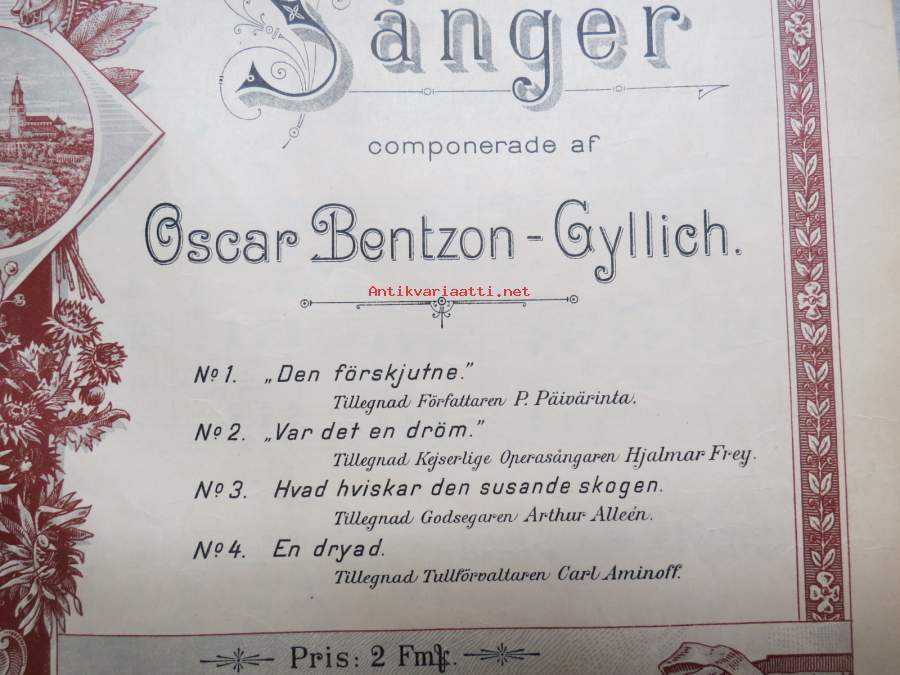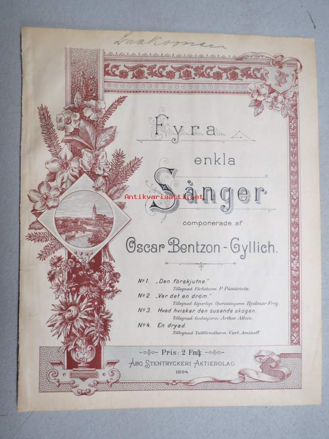 Fyra enkla sånger compnerade af Oscar Bentson-Gyllich -nuotit, painettu "Åbo Stentryckeri" 1894, Aurajoki-vinjetti kannessa