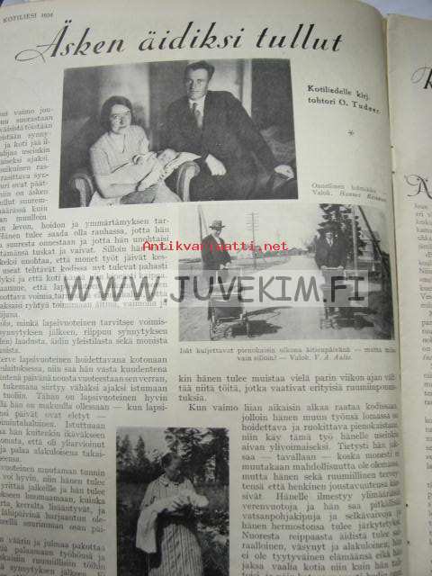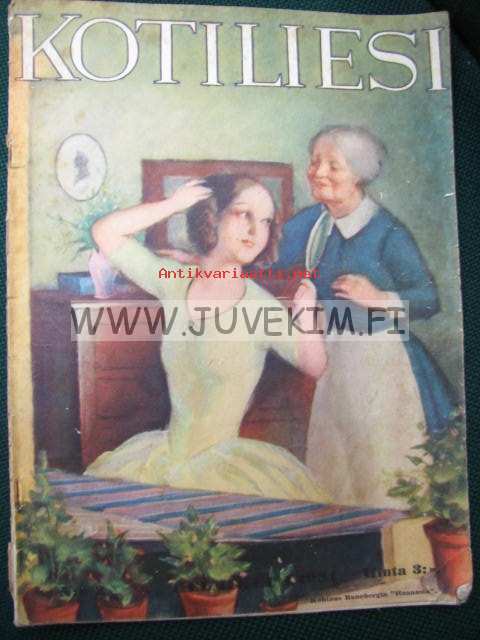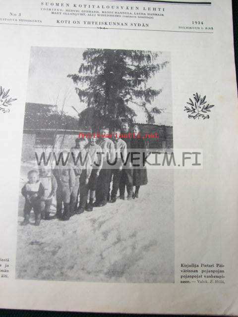 Kotiliesi 1934 nr 3 kansi Rudolf Koivu "Runebergin Hanna", työkalujen teroittamisesta kotitaloudessa, Joutsenon reikäommel, taulujen hoidosta kotona, puvun leikkaamiseen tarvitaan kaavat, mainoksia mm. Silo, Nissen. Kuva nimilehdellä: kirjailija Pietari Päivärinnan pojanpojan pojanpojat