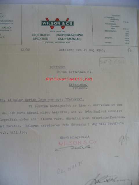 Wilson & Co Linjetrafik Spedition Skepsklarering Asiakirja 1940