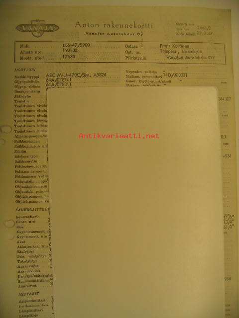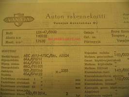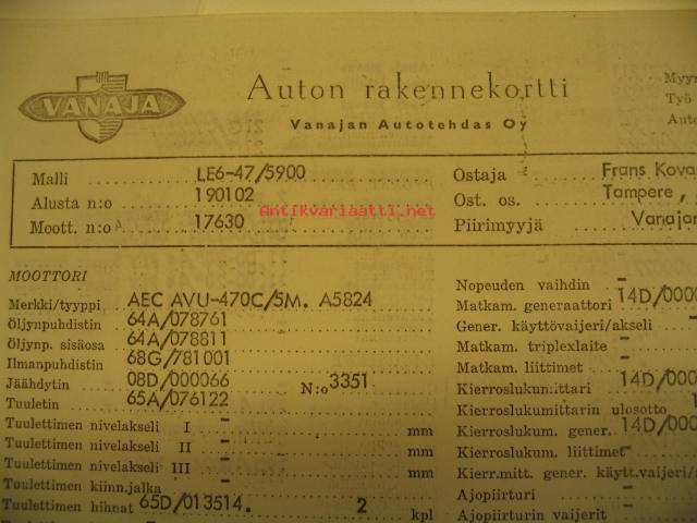 Alusta nro 190102, moottorin numero 17630.Frans Kovaselle Tampereen Messukylään toimitettu auto. Rakennekortti, jossa täydelliset tekniset tiedot autosta tehtaalta toimitettaessa.