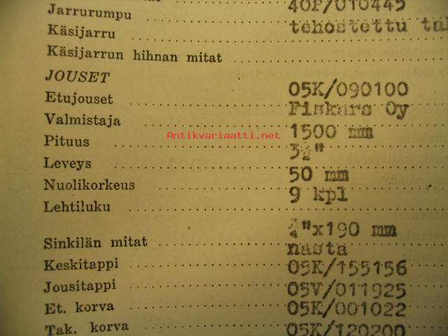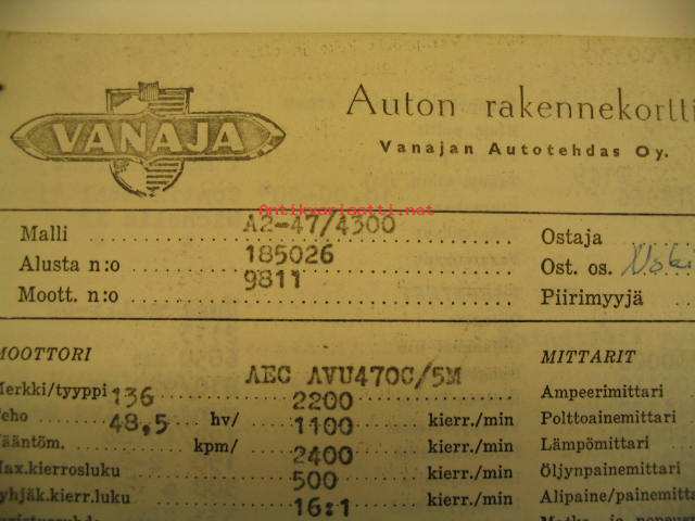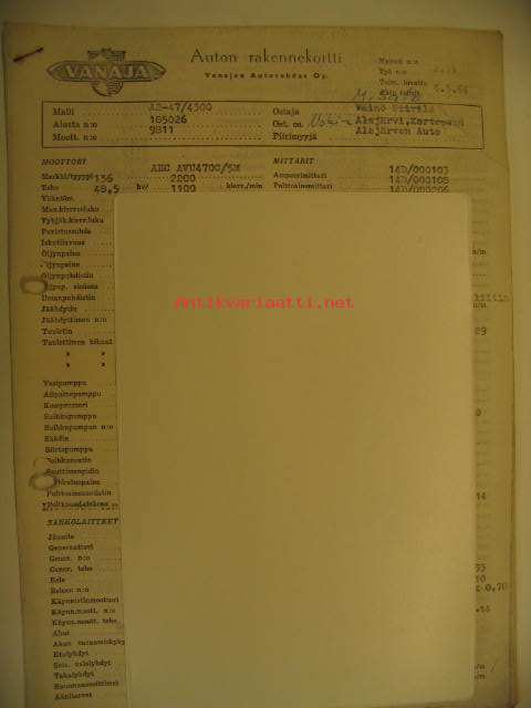 Auton alusta numero 185026, moottorin nro 9811, toimitettu M. Salolle Nokialle, Väinö Siirilä, Korteperä yliviivattu. Kortissa on kaikki tehtaan tekniset tiedot tähän autoon.