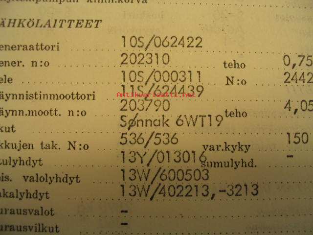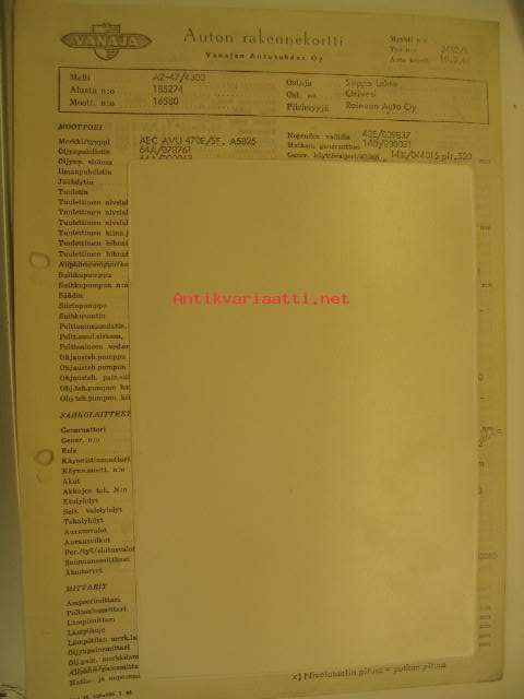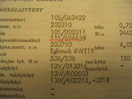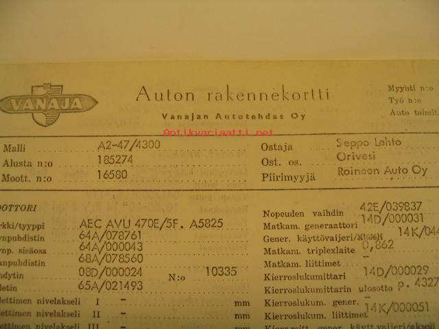 Vanajan autotehdas Oy, 1966Alusta nro 185274, moottori nro 16580, ostaja seppo Lehto, Orivesi. Kortti siosältää kaiken teknisen tiedon asennuksista ja osista.