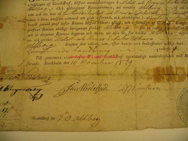 Kisällinkirja F.O. Ahlbergillle (suomalainen). Ollut Tukholmassa opissa T. Schmidt´illä ja saa nyt oman kisällinkirjan metallin- ja pronssinvalurin ammattiin. Tuolloin saatiin oppia uusista rajoista huolimatta muissakin maissa. Kirjan kunto huonohko, mutta todella harvinaista materiaalia yksityisissä kokoelmissa.