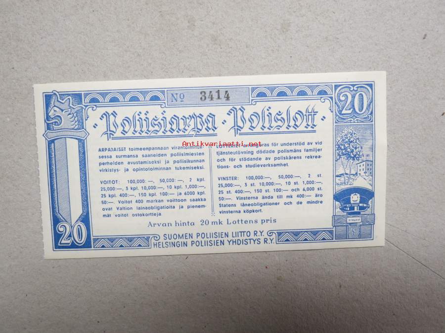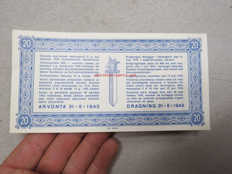 Poliisiarpa, arvonta 31.5.1943 nr 3414 Polislott -lottery ticket