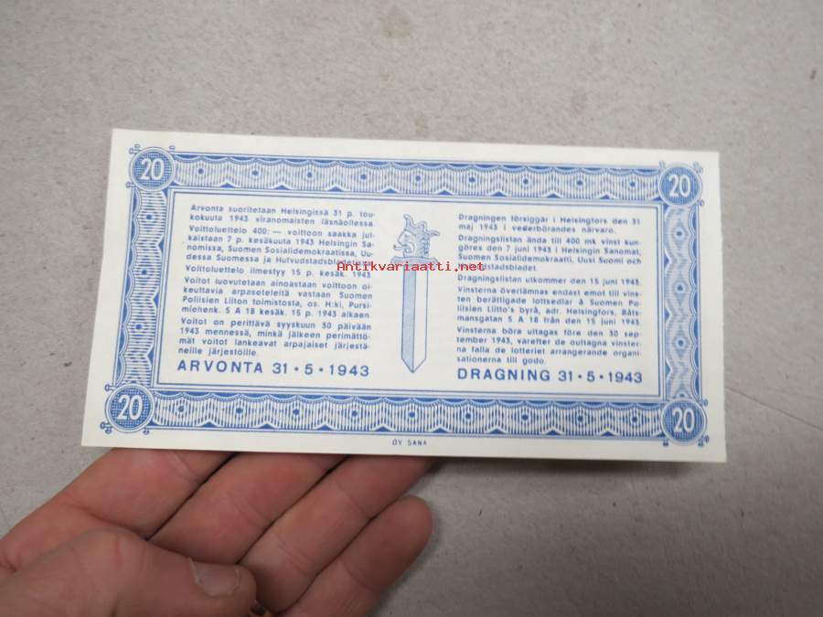 Poliisiarpa, arvonta 31.5.1943 nr 3413 Polislott -lottery ticket