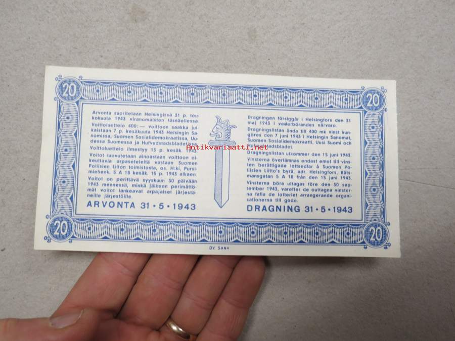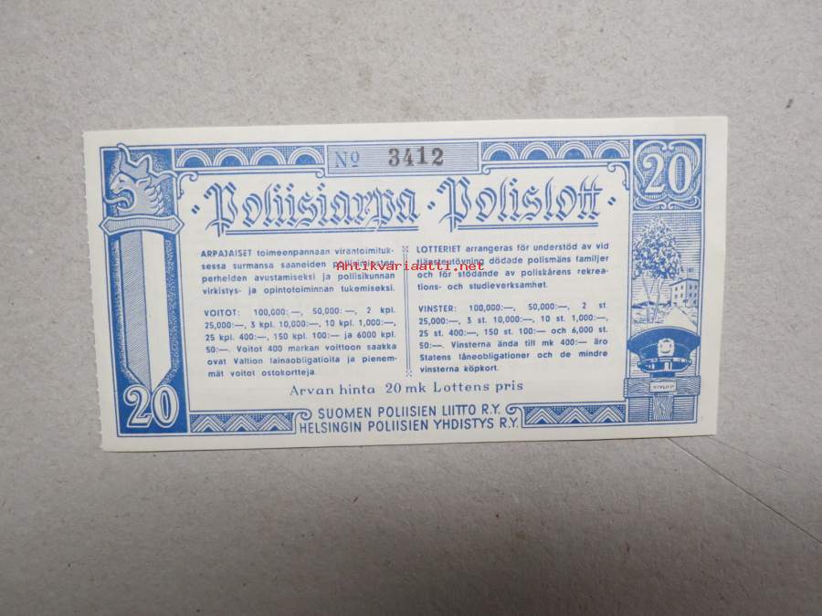 Poliisiarpa, arvonta 31.5.1943 nr 3412 Polislott -lottery ticket