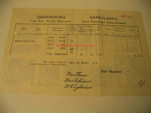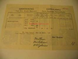 Turun Kaupungin KaasutehdasLasku on kirjoitettu vuonna 1916.