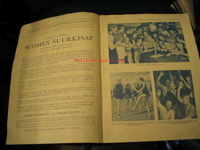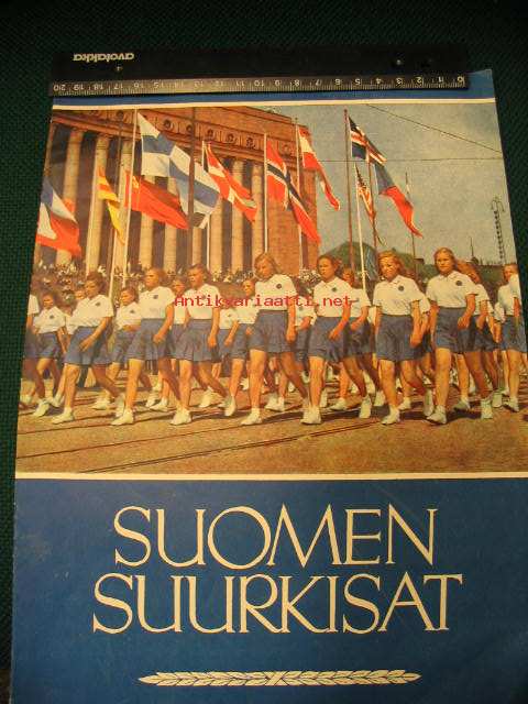 Kyseessä Suurkisojen 1948 muistojulkaisun esite, takasivulla tilauslista. Sini/valkoinen painatus. 3 sivua kuvia. Ehkä Sinä itse kuvassa mukana tai muuten mukavia muistoja noilta ajoilta!