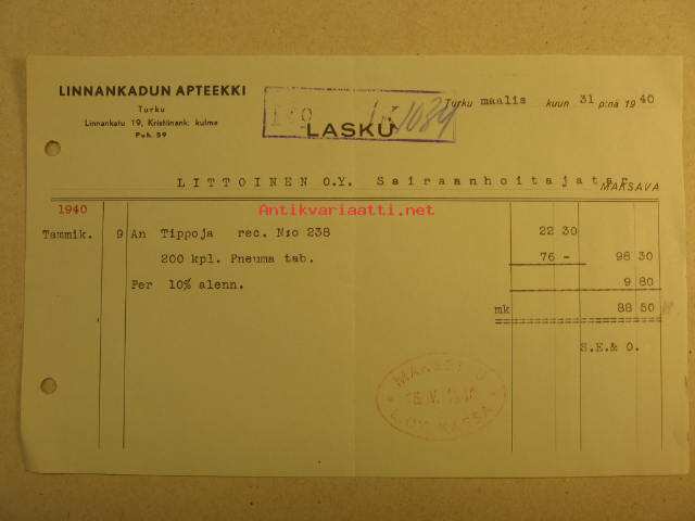 1940Littoinen Oy:n sairaanhoitajan tilaamat lääkkeet.