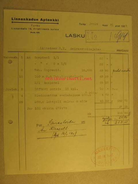 Linnankadun Apteekki Lasku 31.12.1940