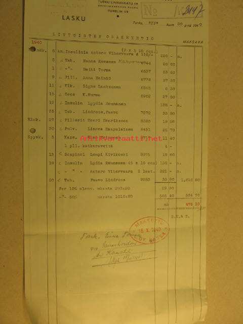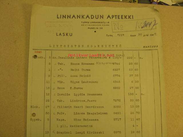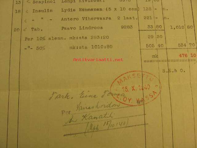 1940Littoisten Oy:n lääkelasku.