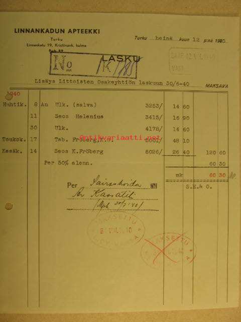 | Saatavilla | 1 kpl | | Julkaisuvuosi | 1940 | | Sivuja | 1 | | Kunto | K3 | | Kielet | Suomi |