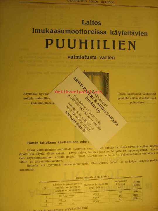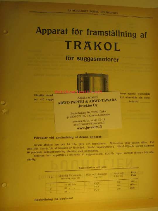 Puuhiilien valmistuslaite (imukaasumoottorit) myyntiesite vm. 1912