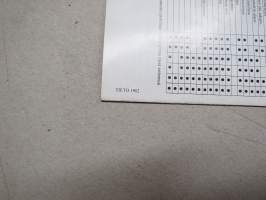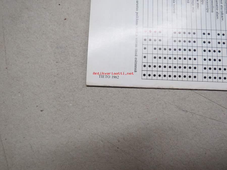 | Saatavilla | 1 kpl | | Julkaisuvuosi | 1982 | | Sivuja | 12 | | Kunto | K3 | | Sidonta/painoasu | Pienpainate | | Kielet | Suomi |