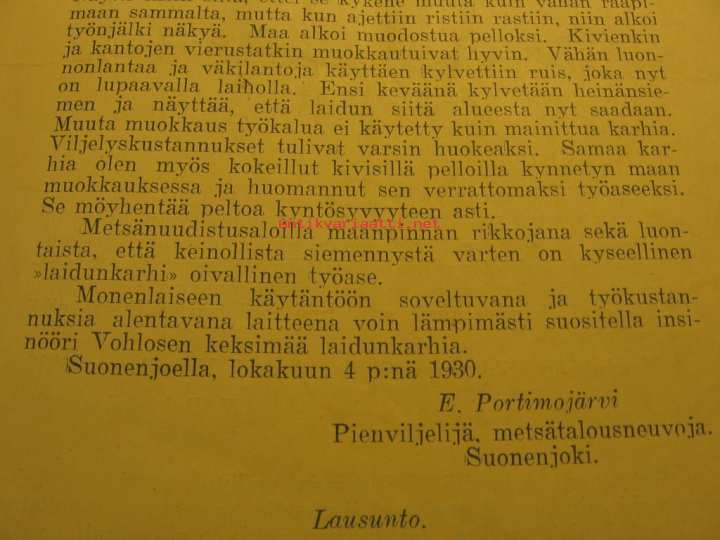 Laidun- ja metsä karhi Riiviö 1932 -myyntiesite