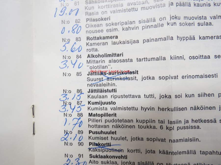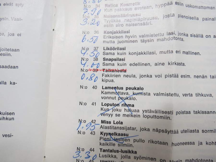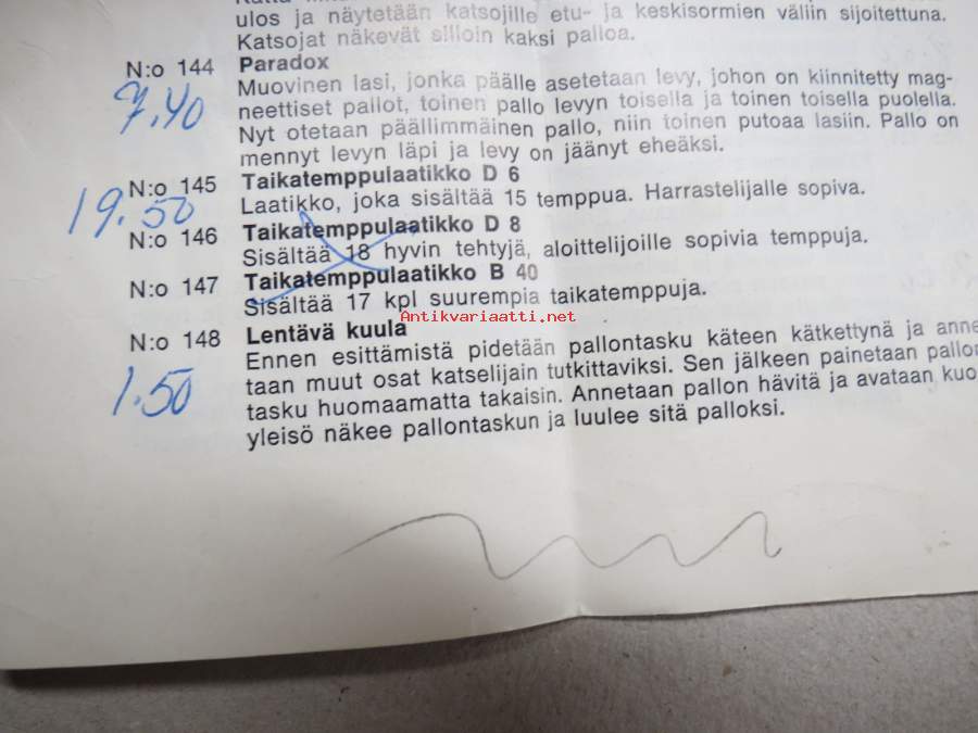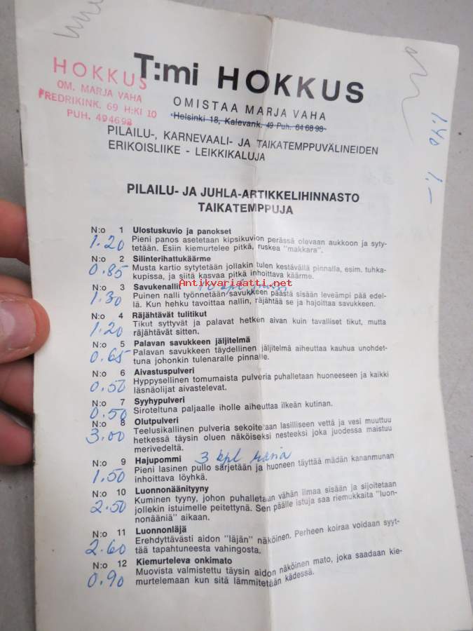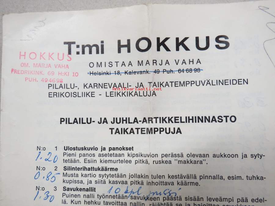 Tmi Hokkus (omistaja Marja Vaha) -pilailu-, karnevaali- ja taikatemppuvälineiden luettelo