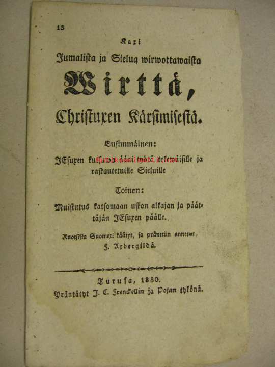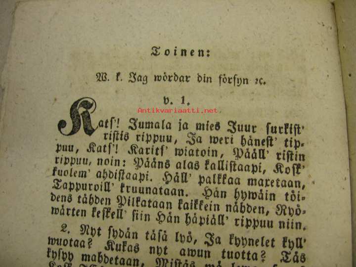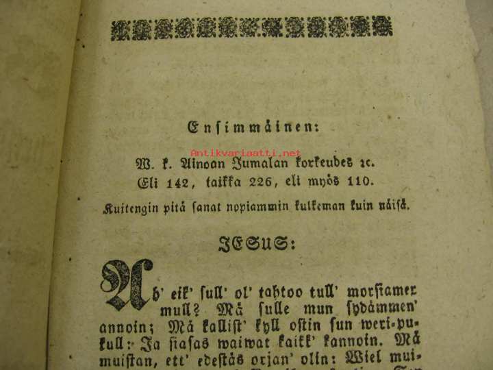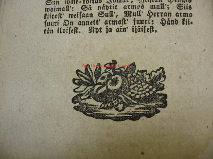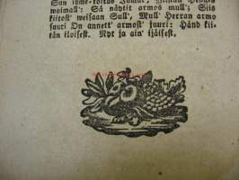 | Saatavilla | 1 kpl | | Julkaisuvuosi | 1830 | | Sivuja | 8 | | Kunto | K3 | | Kielet | Suomi |
