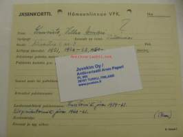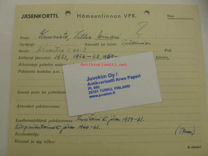 Hämeenlinnan VPK jäsenkortti Mustonen Martti Ilmari