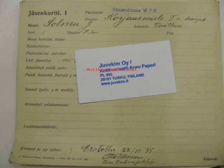 Hämeenlinnan VPK jäsenkortti Solmu J