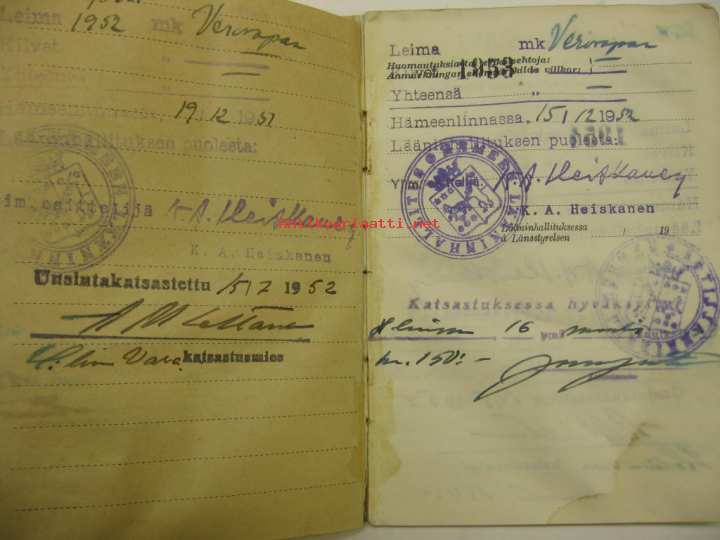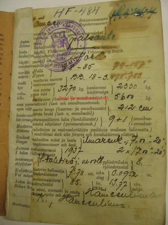Ford V-8 85 1937 Hämeenlinnan VPK paloauto rekisteriote