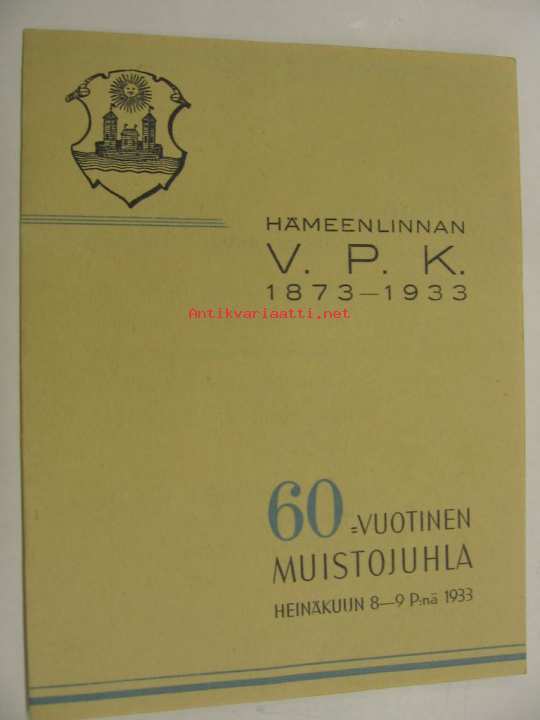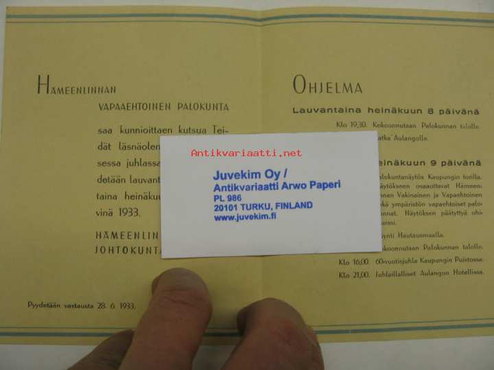 Hämeenlinnan VPK 60-vuotisjuhla 1933 -kutsukortti