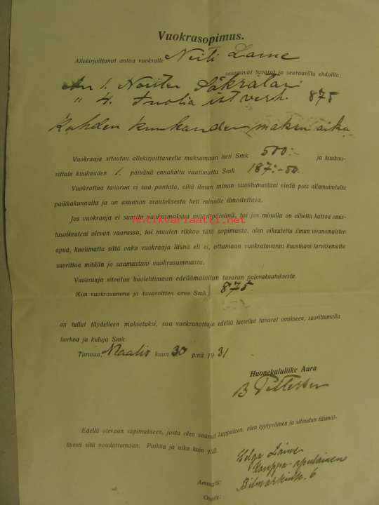 Huonekalujen osamaksu / vuokrasopimus 1931 Helga Laine