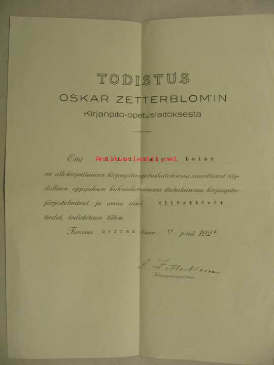 Todistus Helga Laine Oskar Zetterblomin Kirjanpito-opetuslaitoksesta