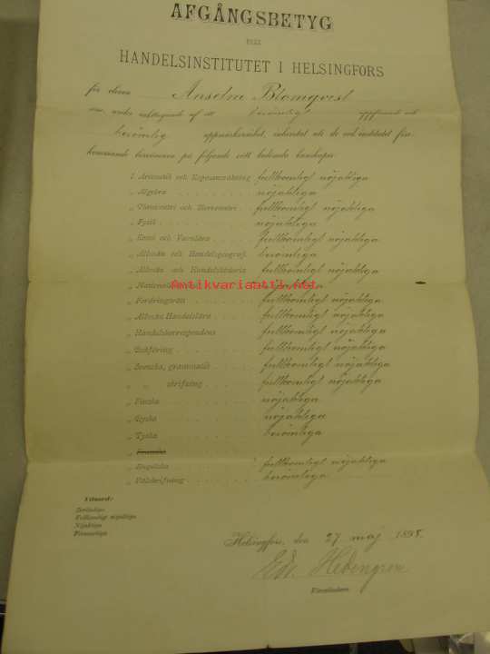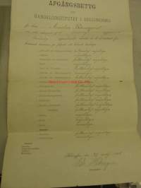 Afgångsbetyg Handelsinstitut i Helsingfors 1898