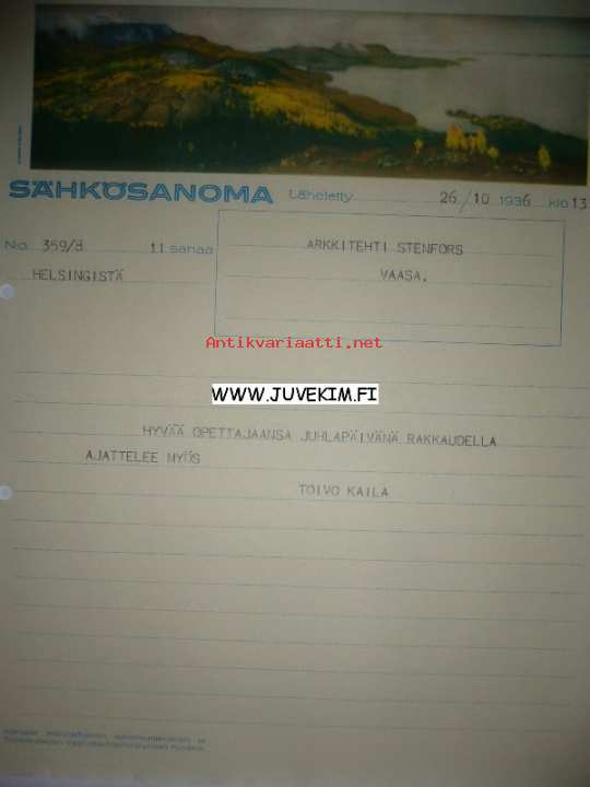 Arkkitehti Stenfors Helsinki 26.10.1936 -sähkösanoma
