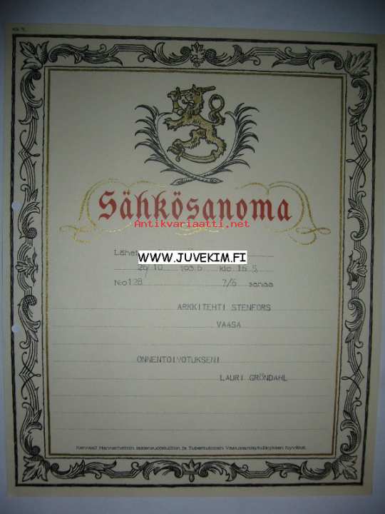 Arkkitehti Stenfors Riihimäki 26.10.1936 -sähkösanoma