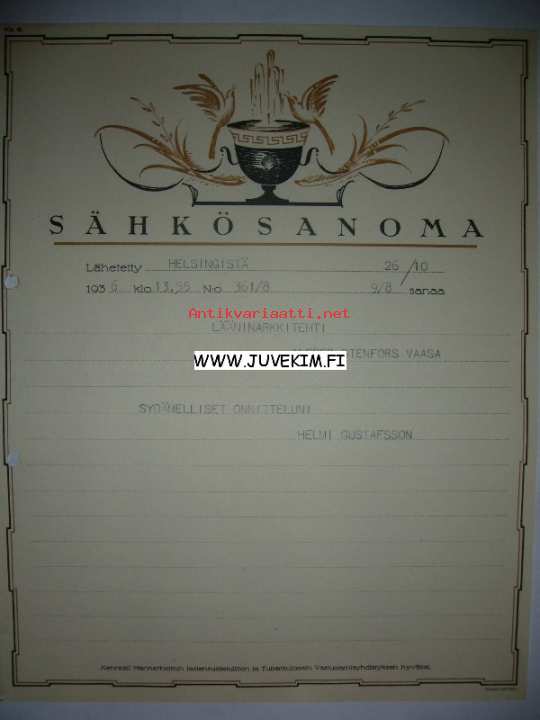 Lääninarkkitehti Stenfors Helsinki 26.10.1936 -sähkösanoma