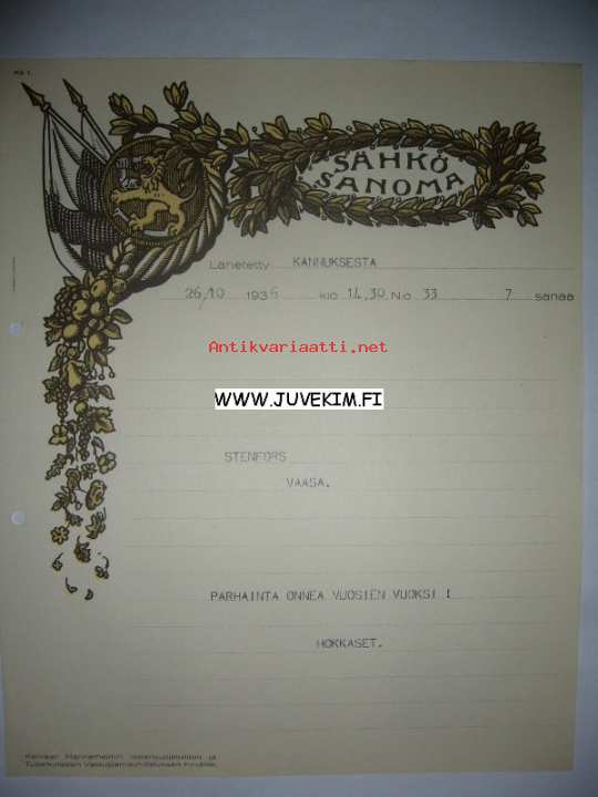 Stenfors Kannus 26.10.1936 -sähkösanoma