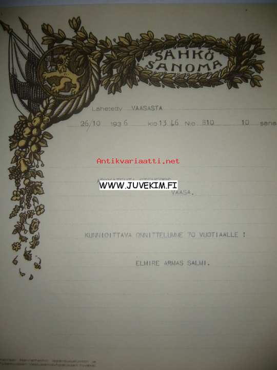 Arkkitehti Stenfors Vaasa 26.10.1936 -sähkösanoma